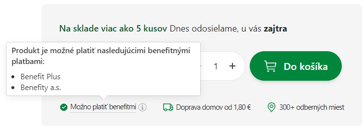 Také produkty spoznáte tak, že v detaile produktu nájdete informáciu Možno platiť benefitmi. Po kliknutí na ňu si môžete skontrolovať, či je možné daný produkt zaplatiť práve vašou benefitnou kartou.