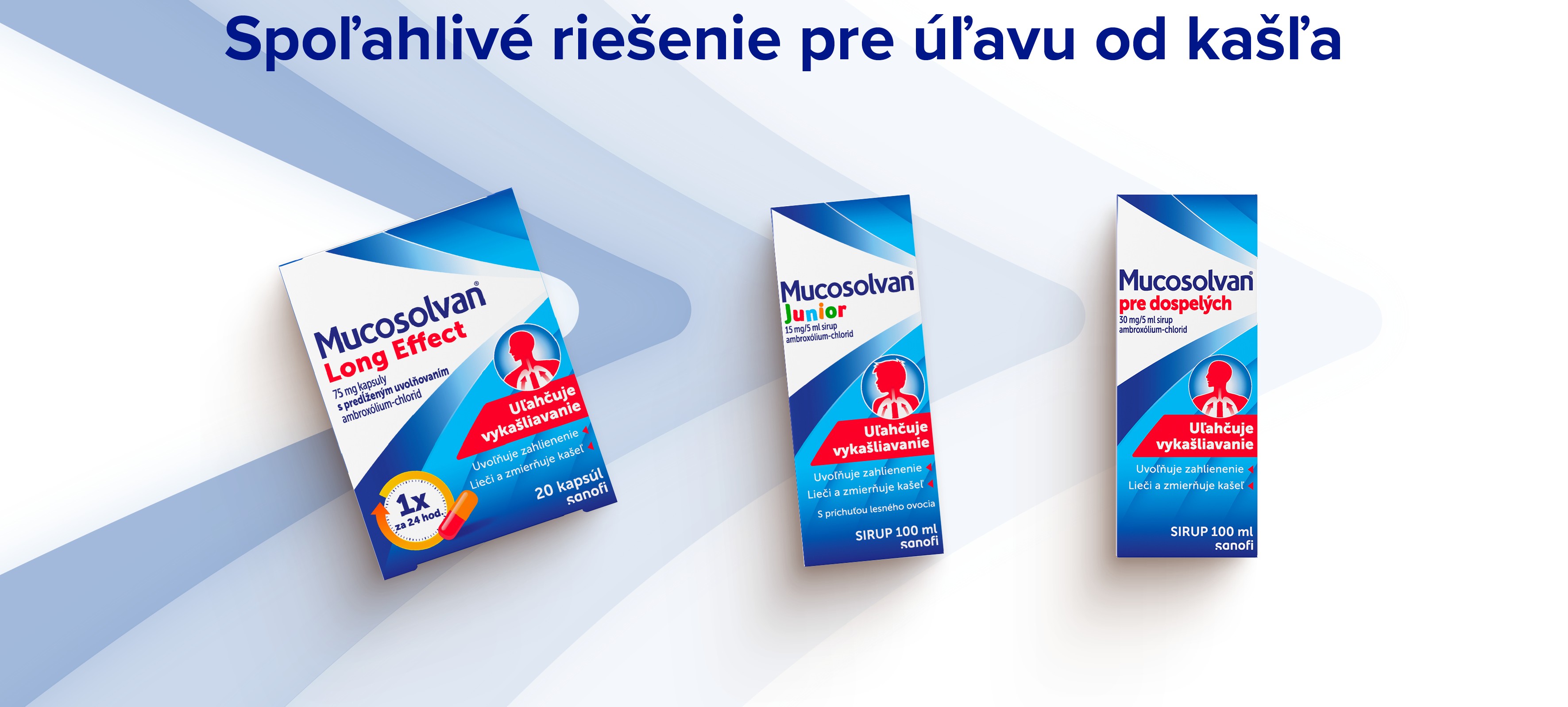 Mucosolvan® pre dospelých, Mucosolvan® Long Effect a Mucosolvan® Junior sú voľnopredajné lieky na vnútorné použitie. Obsahujú ambroxólium-chlorid. Pozorne si prečítajte písomnú informáciu pre používateľa.