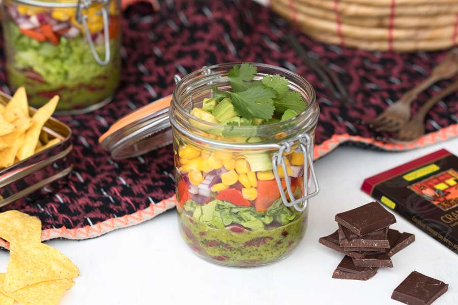 Rozmixujeme všetky prísady na dresing v mixéri, kým sa dobre nespoja. Na dno každého z pohárov dáme 3 pol. lyžice dresingu a naň položíme fazuľu ako prvú vrstvu. Potom postupne pridávame všetky ingrediencie na šalát, aby sme vytvorili vrstvy.Môžeme pridávať v tomto poradí: šalát, papriky (sušené paradajky), cibuľu, kukuricu, avokádo a navrch lístky koriandra. Uzavrieme poháre a pred podávaním v nich šalát pretrepeme. Uistíme sa, že je dresing rovnomerne rozložený.