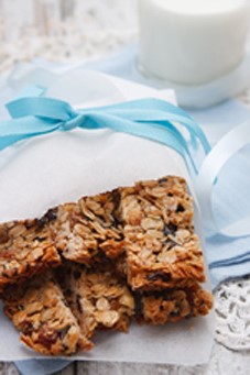 Ak používame veľké ovsené vločky, vopred ich ľahko rozmixujeme na menšie kúsky. Na plechu v rúre upražíme vločky, sezam a sekané oriešky pri 180 ° C asi 10 minút. Medzitým privedieme do varu v kastróliku smer hnedého cukru, medu, masla a soli. Všetko za tepla zmiešame s hrozienkami, dáme do pekáča vyloženého papierom na pečenie, poriadne utlačíme a po vychladnutí nakrájame na tyčinky.