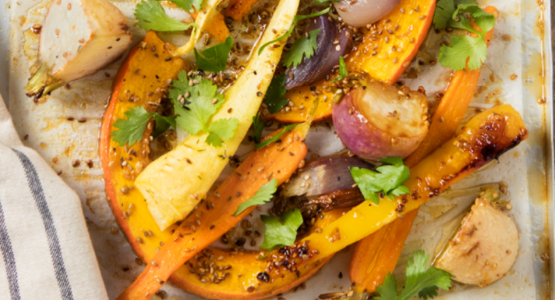 Koriander spolu s horčičnými semienkami a korením rozdrvte. V mise pripravte marinádu: zmiešajte javorový sirup, balsamico, olej, sezamové semienka, rozdrvené korenie a soľ. Zeleninu očistite, tekvicu zbavte semien. Tekvicu nakrájajte na prúžky, mrkvy rozkrojte pozdĺžne napoly, paštrnák, kvaka a šalotku nakrájajte na štvrtiny. Potom zeleninu polejte marinádou a dobre premiešajte. Zeleninu rozložte na plech vyložený papierom na pečenie a pečte 40 minút na 180 °C. Počas pečenia zeleninu niekoľkokrát premiešajte. Vo chvíli, keď bude mäkká a skaramelizovaná, je hotová. Nechajte ľahko vychladnúť a podávajte posypanú čerstvými bylinkami.