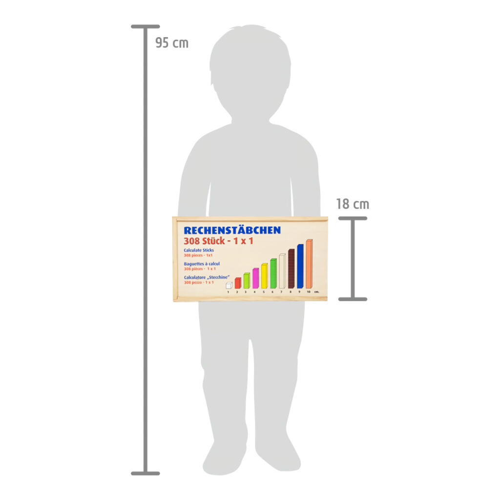 Rôzne dĺžky tyčiniek slúžia ako orientačná pomôcka. Deti predškolského veku získajú základné matematické zručnosti pri počítaní, porovnávaní a triedení tyčiniek. Tieto tyčinky sú ideálnymi spoločníkmi pre matematických profesionálov všetkých vekových kategórií. Trénujú predstavivosť a logické myslenie a zároveň odovzdávajú pochopenie veľkostí a farieb. Všetky tyčinky je možné po ukončení učenia roztriediť a uložiť do priloženej drevenej krabice s posuvným vekom. Rozmery: 32x3,5x18 cm.