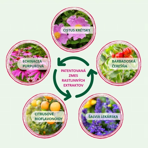 Cistus krétsky extrakt (1,90 g), echinacea purpurová extrakt (3,06 g), šalvia lekárska extrakt (0,88 g), citrus bioflavonoid komplex (0,05 g), acerola extrakt (0,02 g), kyselina hyalurónová, mätová aróma, aloe barbadoská extrakt, voda, phenoxyetanol, etylhexylglycerín.